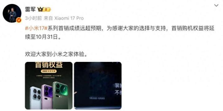今天,小米创办人,董事长兼CEO雷军发布消息表示,小米17系列首销成绩远超预期,为感谢大家的选择与支持,首销购机权益将延续至10月31日。